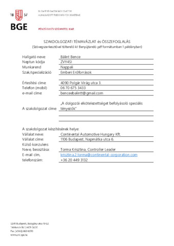 Bálint Bence (2020) A dolgozói elkötelezettséget befolyásoló speciális tényezők. Pénzügyi és Számviteli Kar.
