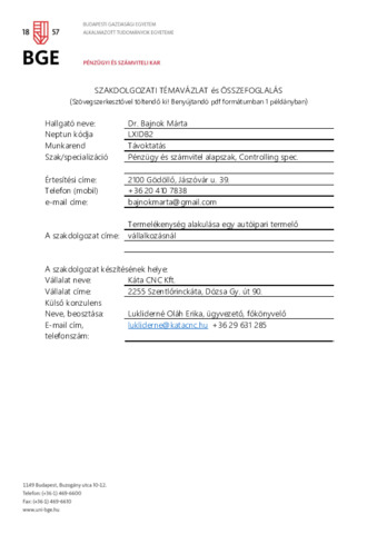 Bajnok Márta (2020) Termelékenység alakulása egy autóipari termelő vállalkozásnál. Pénzügyi és Számviteli Kar.