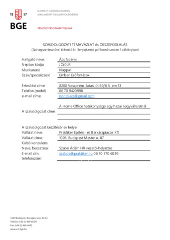 Jelen kutatásban a Home Office hatékonysági kérdéseivel foglalkozom. Választásomat elsősorban a 2020-ban bekövetkezett pandémiás helyzet indokolja, hiszen ez ráirányította figyelmemet az otthoni munkavégzés lehetőségére, illetve ennek szükségére. A vállalatok eddig nem látott ütemben álltak át erre a munkavégzési formára világszerte, ezek a tények ösztönöztek arra, hogy megvizsgáljam a home office-al kapcsolatos hatékonysági kérdéseket, felmerülő aggályokat, és bemutassam mind a munkavállaló, mind pedig a munkáltató oldaláról. Ahhoz, hogy el tudjam végezni a kutatást, először meg kellett határoznom a témakört érintő fogalmakat. Készítettem egy SWOT analízist, mely segítségével könnyen átláthatóvá vált a távmunkában rejlő potenciál. Végül bemutattam Európa és Magyarország távmunka és home office foglalkoztatási adatait az elmúlt 10 évből. A szakirodalmak, folyóiratok, és könyvek áttekintése segített megállapítani az otthoni munkavégzés előnyeihez és hátrányaihoz kapcsolható kutatási kérdéseimet, melyet a Praktiker Kft.-nél végzett kutató munkámmal kívánok alátámasztani. Elsőként egy szekunder kutatás keretein belül vizsgáltam meg kettő a vállalat által kitöltetett kérdőív eredményeit. A kérdőívek a munkavállalók elégedettségén, és tapasztalatain alapszik. A májustól, októberig eltel fél év alatt javuló tendenciákat vélünk felfedezni a visszajelzésekből. A kitöltőknek értékelniük kellett mind személyes, mind pedig szakmai szemszögből az otthoni munkavégzés előnyeit és hátrányait. A munkavállalók közel 92%-a szeretné, ha a vállalat továbbra is alkalmazná ezt a fajta munkavégzési formát, mivel számos előnyük származik belőle. Illetve az elmúlt időszak tapasztalatai alapján kategorizálták, hogy miben szeretne fejlődni, hogy a jövőben még eredményesebb, és hatékonyabb legyen a munkavégzés. Primer kutatásom során a három a Hr osztályon dolgozó munkatárssal készítettem strukturált interjút. Szerettem volna nagyobb rálátást kapni, hogy a Hr osztály milyen nehézségeket, vagy előnyöket tapasztal a home office kapcsán. Alapvetően nem találtak kivetnivalót az otthoni munkavégzést tekintve, sem személyes tapasztalatból, sem pedig kollégáktól való visszajelzésekből. A legtöbb esetben zökkenő mentesen vették az akadályokat. Legfőképp technikai jellegű problémák merültek fel, például egy Ms Teamsen lefolytatott állásinterjú, vagy gyakorlati képzés során. A munkavállalók motivációját úgy szeretnék fenntartani, hogy olyan közösségi programokat, illetve alternatívákat találni és tanácsolni a kollégáknak, ami segít a hosszú távú elégedettség megtartásában. Továbbá fontos számukra, hogy a személyes kontaktust is fenn tudják tartani a munkavállalók körében, és ne szigetelődjenek el. Úgy vélik, hogy mivel ez még egy új, nem teljesen kiforrott rendszer a cégnél, így még akadnak hiányosságai, viszont mindezt a közeljövőben szeretnék megoldani, illetve fejleszteni. Az informatikai nehézségeket igyekeznek kiküszöbölni, illetve megkönnyíteni az alkalmazottak home office szokásait, hogy könnyebben hatékonyabban tudjanak dolgozni, így akár egy e köré szerveződő tréninget is érdemes szervezni. Ez segíthet a kollégákkal való kapcsolattartásban, vagy esetleg a munkára adott visszacsatolásban felettes-beosztott között. Összegezve a kutatásom alapján azt a konzekvenciát vonhatjuk le, hogy otthonunkból is hatékonyan elvégezhető számos feladat, így érdemes a jövőben fenntartani, és fejleszteni ennek lehetőségét. Kutatásom célja, hogy segítsem az ideális home office kifejlesztését a vállalatoknak.