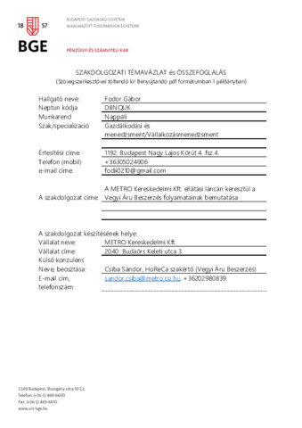 Szakdolgozatom célja a több, mint egy éves munkaviszonyom során a két talán legfontosabb kérdés jelenleg, ami a METRO Vegyi Áru Beszerzéséhez köthető. A koronavírussal kapcsolatban az első, hogy „Vajon a COVID-19 első itthoni hulláma hogyan hatott a szakmai gyakorlatom ellátási láncára?”, valamint „Járvány után hogyan tovább, mire fókuszáljon a vegyi áru beszerzés, ha már nincs szükség ekkora mennyiségű „COVID termékekre”?”. Ahhoz, hogy a kérdésekre megfogalmazhassam a javaslataim szükség volt a beszerzést felépíteni az alapjaitól az ellátási lánctól. Ezért a dolgozatom elméleti részében az általam relevánsnak vélt szakirodalmak alapján bemutattam az ellátási lánc elméletét, kitérve két ellátási lánccal kapcsolatos modell, a Porter féle értéklánc és a Stakeholder modell bemutatásával zárva. Majd az ellátási lánc elméleti bemutatását követően ismertettem a beszerzés értelmezését, céljait, vállalati stratégiával kapcsolatát az áru rendelés elméletét egy kereskedelmi cégnél, név szerint a METRO-nál továbbá a beszállítók értékelésének lehetséges alapmódszereit. Az elméleti áttekintést követően bemutatásra került a szakmai gyakorlati helyem. Gyakorlati helyemmel kapcsolatosan szemléltettem a Cash&Carry-t, utána kitértem a vállalat hazai üzletláncára a METRO Kereskedelmi Kft-t, ahol ténylegesen töltöttem a szakmai gyakorlatomat. Az iroda felépítését a vállalat főbb mutatóinak elemzése követte, ahol az árbevétel és a konkurenciák árbevétele összehasonlítása került górcső alá. Az árbevétellel kapcsolatos elemzést követően áttértem az elméleti részben bemutatott ellátási láncra a gyakorlatban a vállalaton belül. Az ellátási lánc felépítésében kitérve a szállítási formákra, amelyek közvetlenül kapcsolódnak a beszerzés szállítóinak szállítási formáihoz. Ez után a következő fejezet a Vegyi Áru Beszerzésről szólt, ahol gyakornoki pozícióban járulok hozzá a vállalat céljainak eléréséhez. Bemutatásra került az osztály három kategóriája és azok alapszintű megismeréséhez pár mutató elemzése. Az osztály bemutatása végeztével részleteztem főbb feladataimat, amelyeket napi szinten látok el. Majd a terület megismerése után az olvasónak bemutattam az elméleti részben említett Porter féle értéklánc és a Stakeholder elemzés gyakorlati megvalósulását a METRO-nál, amelyek ismertetéséhez a külső konzulensemmel folytatott egy órás mélyinterjú kérdéseinek tartalomelemzése járult hozzá. Az elméleti és gyakorlati rész lezárását az Összegzés fejezet követte, ahol a kutatási kérdéseimet válaszoltam meg, a hozzájuk kapcsolódó problémák felvetésével és azokra tett javaslataim megfogalmazásával.