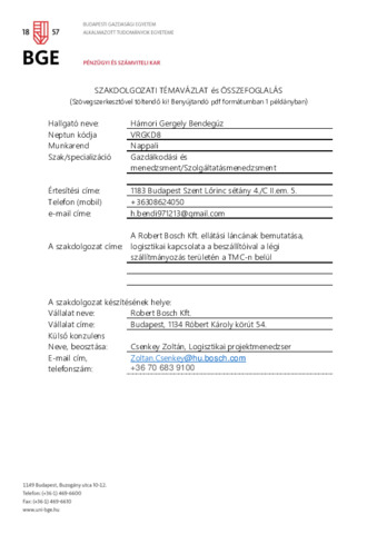 Összefoglalás:Diplomamunkám témája a Robert Bosch Kft. ellátási láncának bemutatása, logisztikai kapcsolatai a beszállítóival a légi szállítmányozás területén a TMC-n belül. Dolgozatom megkezdése előtt megfogalmaztam magamban pár kérdést, amelyekre fókuszálva írtam a munkát. Ezen kérdések a következők: hatékony-e a cégnél történő légi szállítmányozás folyamatainak a felépítése? Milyen problémák, nehézségek lépnek fel ezen a területen? Hogyan épül be az érintett terület az ellátási láncba?Ezen kérdések megválaszolását egy elméleti áttekintéssel kezdtem, ahol számos könyv felhasználására sor került, valamint nagy mértékben hagyatkoztam az iskolai évek alatt megszerzett alaptudásomra. A gyakorlati rész alapját viszont a fél év során megszerzett tapasztalatok, online kurzusok, munkahelyi vezetőmmel folytatott interjú, illetve beszélgetések adták.Az első fejezet célja a ismertetni a témaválasztás okát, annak aktualitását, illetve bemutatni a kutatás módszertanát, kérdéseit.A második fejezetben bemutatásra kerül az ellátásilánc-menedzsment fontossága, annak eszmei háttere, előnyei, hátrányai. Ezt követően szó esik egy esetleges lánc tagjairól, illetve annak konstrukciójáról is. Ezt a főbb nagyfejezetet két általam fontosnak vélt modell bemutatásával, a Porter-féle értéklánc modellel, illetve a Stekholder elemzés bemutatásával zárom. Eztkövetően a harmadik fejezetben a logisztika elméleti hátterét vizsgálom rövidebben, hiszen ez is szervesen kapcsolódik dolgozatom témájához.Ezután a dolgozat gyakorlati része következik, ahol bemutatásra kerül a cég történelmi áttekintése, valamint a cég hazai mutatói. Fontosnak tartom a cég kilenc telephelyének bemutatását, valamint a gyártmányok alapvető prezentálást, hiszen ez is segíti az összkép kialakulását. Ezután rátérek a budapesti TMC létrejöttére, céljára, részterületire, többek között annak a területnek a bemutatására is, ahol a gyakornoki időszakomat töltöttem. Alapszintű betekintés nyerhet az olvasó az egyik fő munkafolyamat ismertetéséről ezt követően, ugyanis itt fog szó esni beszállítói kapcsolatokról, valamint a szállítmányozó cégek teljesítményeiről. Az utolsó két fejezet a két gyakorlati modell megvalósulását fogja górcső alá venni. Itt bemutatásra kerülnek az elsődleges tevékenységek, másodlagos tevékenységek, valamint az érdek és hatalom viszonylatában alakuló partneri kapcsolatok. majd ezt követően összegzésre fog sor kerülni, ahol leírásra kerülnek javaslatok, személyes érzések, élmények.