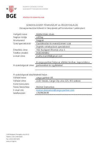 Szakdolgozatom témája a cargo-partner helye az ellátási láncban, kapcsolatai a partnerekkel és ügyfelekkel. A dolgozat első részében megindokoltam miért is választottam ezt a témát, illetve említést tettem a téma aktuális helyzetéről is. Az elméleti részben az ellátási lánc menedzsment pontos meghatározására helyeztem a hangsúlyt néhány definíció és magyarázat segítségével. Bemutattam, hogyan épül fel egy ellátási lánc és ismertettem milyen szereplői lehetnek ennek a modellnek. Szót ejtettem az ellátási háló kialakításáról és fontosságáról is. Ezt követően a logisztikai szolgáltatóvá válás folyamata következett, ahol kitértem a különböző szolgáltató típusokra a logisztikai szolgáltatók kategorizálására is. A következő rész a stakeholder elemzés ismertetése volt, ahol bemutattam, miért is fontos a vállalatok stratégiaépítése szempontjából ez a modell. Szó esett a lehetséges érintettekről, az érdekérvényesítésről és a csoportosításokról is. Ezt követte a partneri és ügyfélkapcsolatok elméleti áttekintése, ahol részletesen kifejtésre kerültek a piaci cserekapcsolatok és stratégiai partnerkapcsolatok. A kutatási rész az általam választott vállalat bemutatásával kezdődik. Az elején a cargo-partner megalakulásáról írtam, majd következett a cég értékeiről egy rövid beszámoló, amit a küldetés és jövőkép követett. Ebben a részben a vállalat tervei spekulációi szerepelnek. Fontosnak tartottam még kiemelni a cargo-partner digitális stratégiáját és társadalmi felelősségvállalását. Úgy gondolom ezek a témakörök fontosak, ahhoz, hogy lássuk mennyire komoly és elkötelezett cégről beszélünk. Ezt követően a vállalat nemzetközi terjeszkedéséről írtam, ahol szó esett az első központok létrehozásairól egészen a mai állapotokig. Ezt követte a szervezti struktúra bemutatása, ahol ismertettem a legfőbb részegységeit a magyarországi cargo-partnernek. Ebben a részben részletesen beszámoltam a különböző osztályok munkájáról, szolgáltatásairól és céljairól. Ezt a részt követte a vállalat stakeholder elemzése, ahol látható, mely vállalatok, hol helyezkednek el a cég életében. Ezeket a csoportosításokat röviden meg is indokoltam. A cargo-partner kft. Magyarországon fejezetben szót ejtettem a hazai beruházásokról, a jelenlegi helyzetről, illetve szó esett a pénzügyi eredményekről is. Itt összehasonlítást is tettem a 2018-as és 2019-es eredmények között rövid indoklással alátámasztva a változásokat. Ezt követte a kutatásom érdemi részét kitevő fejezet, melynek címe: A cargo-partner helye az ellátási láncban, kapcsolatai a partnerekkel és az ügyfelekkel (a légi osztály elemzése). Ennek a témának a megválaszolására több mini interjút készítettem a munkatársaimmal, melyeknek a fő kérdései: ·         Hogyan épül be a cargo-partner kft. az ügyfelei ellátási láncába? ·         Milyen folyamatokat végzünk ebben a láncban? ·         Hogyan értékeljük a partnereinket? ·         Milyen a kapcsolatunk a partnereinkkel? ·         Mit gondolnak a partnerek a cargo-partner-ről?   Ezen kérdések alapján a légi osztály minden részlegét ki tudtam elemezni. A sort a légi importtal kezdtem, ahol bemutatásra kerültek a legfőbb folyamatok, ezt követte az emergency részleg, ahol olyan szállítmányokat kell kezelni, melyek nagyon sürgősek. Erre közúti vagy légi megoldást kell találnia az ott dolgozóknak. Ezt követte a légi export folyamatok bemutatása, a kiscsomagos (courier) szolgáltatások ismertetése, végül pedig a pricing csapat munkájáról írtam részletesebben. Ezt követte két konkrét példa az ellátási láncba való mély beépülésre. A Nuki és a LiSEC nevű vállalatok példáján keresztül tisztán látható, milyen módokon képes a cargo-partner beépülni az ellátási láncokba. A következő rész a cargo-partner partner kapcsolatait mutatja be. Ezt legjobban a partner-és alvállalkozók évenkénti kiértékelése ismerteti. Minden évben egy több szempontból álló értékelést adnak a vezetők a partnereknek és alvállalkozóknak, amely által megtudják milyen besorolást kapnak. Külön a légitársaságok is kapnak a cégtől egy ilyen értékelést. Az ügyfél kapcsolatok bemutatása szintén egy kérdőíves felmérés alapján rajzolódik ki. Minden évben kiküldésre kerülő kérdőív alapján a cargo-partner kap egy értékelést az előző évi szolgáltatásainak minőségéről. Ezt kielemezve kaphat a cég egy képet arról, miken kell fejleszteni és mik azok a folyamatok, amik jól működnek. Az utolsó részben összegzem a tapasztalataimat, összevetem a megfigyeléseimet az elméletben tanultakkal majd javaslatokat teszek néhány fejlesztendő területre.