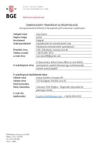 A szakdolgozat betekintést nyújt egy multinacionális vállalat könyvelési osztályának a mindennapjaiba a koronavírus járvány előtti, és közbeni időszakában. Egy esettanulmány során részletesen kifejtésre kerül, hogy a vezető milyen eszközökkel és megoldásokkal állította át a szervezet a teljes ideglenes távmunkára. Mindezt mélyinterjú formátumban közvetlenül a vezetővel zajló elbeszéléseim alapján. Olyan témákat ölel át az esettanulmány, mint a megnövekedett kontrolligény, a bizalom a vezető és a dolgozó között, a kommunikáció mértéke és annak fontossága. Továbbá egy kvantitív kutatásban megtudhatjuk, hogy milyen az osztályon dolgozók elégedettsége a home office-szal és a távmunkával kapcsolatban. Végezetül a vezető értékeli az átállás sikerességét, a dolgozók teljesítményét a távmunkában, illetve választ ad arra, hogy a járványt követően a home office-t, mint foglalkoztatási formát alkalmazza e, és ha igen, akkor milyen mértékben.