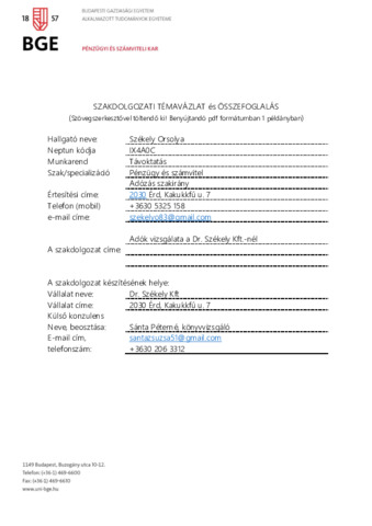 Székely Orsolya (2020) Adók vizsgálata a Dr. Székely Kft.-nél. Pénzügyi és Számviteli Kar.