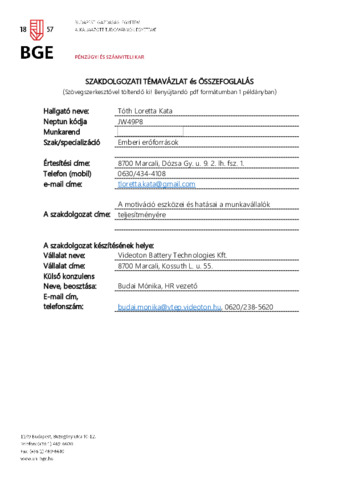 Tóth Loretta Kata (2020) A motiváció eszközei és hatásai a munkavállalók teljesítményére. Pénzügyi és Számviteli Kar.