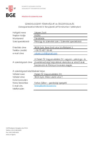 Selyem Zsolt (2020) A Patent Őr Vagyonvédelmi Zrt. vagyoni-, pénzügyi- és jövedelmezőségi helyzetének elemzése az elmúlt évek beszámolói és főkönyvi kivonatai alapján. Pénzügyi és Számviteli Kar.