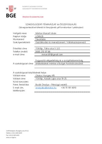 Kulcsszavak: Budget Autókölcsönző, fogyasztói elégedettség mérése, minőség, Otokoc Hungary Kft., SERVQUAL, szolgáltatásmenedzsment, szolgáltatásminőség