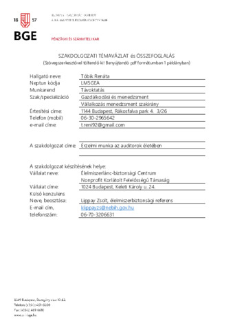 Szakdolgozatom témaköre az érzelmi intelligencia (EQ) és érzelmi munka az ügyfélkapcsolatokban.Az Élelmiszerlánc-biztonsági Centrum Nonprofit Kft. Vendéglátás és Közétkeztetés szemle csoportjánál dolgozom, mely szakmailag a Nemzeti Élelmiszerlánc-biztonsági Hivatalhoz ezen belül az Élelmiszer- és Takarmánybiztonsági Igazgatóság, Vendéglátás és Közétkeztetés Felügyeleti Osztályához tartozik.Szakdolgozatom témáját az itt tapasztaltak alapján választottam és készítettem el.Munkám során egyre jobban kezdett érdekelni, hogy milyen a kapcsolat a munkatársaim (auditor) és az auditált intézmények vezetői, alkalmazottai között és hogy milyen szempontok alapján kommunikálnak velük.Fontosnak tartom ehhez a munkakörhöz az auditorok érzelmi intelligenciáját.Az is foglalkoztatott, hogy a szemlézendő létesítmények hogyan viszonyulnak az audithoz, és az ő érzelmi intelligenciájuk milyen hatással van az auditra.Ezek a kérdések vezettek ahhoz, hogy ezt a témakört válasszam.Kutatásom során arra kerestem a választ, hogy milyen mértékű stresszt jelent az auditorok számára az, hogy különböző konfliktus helyzetekben egy szervezet által meghatározott érzelmi elvárásnak kell megfeleljenek.A dolgozat első részében bemutatom a nálunk zajló munkafolyamatokat, az auditorok munkáját, a szemlék folyamatát, és a koronavírus alatti változásokat. Kitérek a címhez kapcsolódó főbb fogalmakra, mint például az érzelmi intelligencia, érzelmi munka, érzelmek, empátia, kiégés, munkahelyi stressz.A dolgozat második felében, pedig a kutatási kérdésemre kerestem a választ interjúk segítségével.Az érzelmi intelligencia gyakorlati megjelenését szakmai mélyinterjú felvételén keresztül tudtam bemutatni, melyen 10 kollega vett részt, 7 nő és 3 férfi.Az interjúra az előre megírt 13 kérdéssel készültem fel, mely segítette a válaszok összehasonlítását és az elemzést is megkönnyítette. Az elvárásaimtól eltérő válaszokat kaptam.Több stresszre számítottam az auditori munka során. Nem gondoltam arra, hogy mivel ezek a szemlék nem járnak pénzbüntetéssel, ellentétben a hatósági ellenőrzéssel, így nem okoznak  olyan mértékű lelki terhet sem.