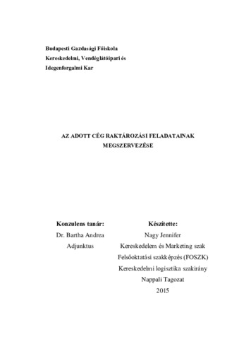 Nagy Jennifer (2015) Az adott cég raktározási feladatainak megszervezése. Kereskedelmi, Vendéglátóipari és Idegenforgalmi Kar.