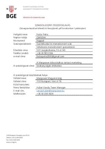 Fodor Petra (2022) A Manpower toborzásához tartozó marketing tevékenységek értékelése. Pénzügyi és Számviteli Kar.